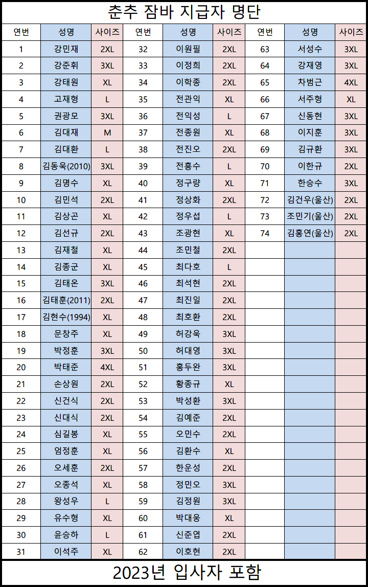 2023년도 안전조끼, 안전화, 춘추잠바 해당자 명단 안내